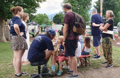 Der ganze Spielplatz wurelte nur so von Kindern, die sich ein Hockeytournier lieferten, sich kreativ bei der Farbschleuder betätigten, ihre sportlichen Fähigkeiten bei Hochsprung, Diabolo, Jonglieren, Seilspringen, Pedalos oder Stelzengehen unter Beweis stellten bzw. ausprobierten und sich zu Schmetterling, Löwe oder Ritter schminken ließen.